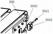 如图3~4所示,所述安装侧板306上设有张紧组件304,所述张紧组件304包括张紧螺栓3041、张紧轮和张紧座3042,张紧座3042固装于所述安装侧板306上,张紧轮设于安装侧板306内侧且所述输送带303绕过所述张紧轮,并且张紧螺栓3041穿过张紧座3042上的螺纹孔后与所述张紧轮的张紧轮轴3043相抵,旋拧所述张紧螺栓3041即可调整所述张紧轮位置,进而实现输送带303的张紧调节,保证输送平稳可靠。