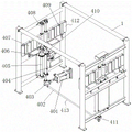 如图5和图8所示,所述摆臂组件412包括第一摆臂409、第二摆臂407、第一摆臂转轴404、第二摆臂转轴405和传动组件,其中第一摆臂转轴404上下两端和第二摆臂转轴405上下两端分别通过轴承座408支承安装于所述架体1对应侧上端和下端的横梁上,第一摆臂409固装于第一摆臂转轴404上,第二摆臂407固装于第二摆臂转轴405上,本实施例中,所述传动组件包括相互啮合的驱动齿轮410和从动齿轮406,其中所述驱动齿轮410安装于第一摆臂转轴404上,所述从动齿轮406安装于第二摆臂转轴405上,所述摆臂组件412中的第一摆臂转轴404下端与所述摆臂驱动组件413中的驱动转板403或从动转板411固连。本发明工作时,所述第一摆臂转轴404通过所述摆臂驱动组件413驱动转动,并通过所述驱动齿轮410和从动齿轮406传递转矩带动所述第二摆臂转轴405同步转动,进而实现第一摆臂409和第二摆臂407同步张合。