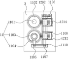 所述第二清洁组件(12)包括设置于传动杆(1107)顶部的主动齿轮(1201)、设置于安装盒(1106)底部的安装板(1211)和设置于安装板(1211)远离清洁辊(1102)一侧的两个安装筒(1212),所述主动齿轮(1201)远离清洁辊(1102)的一侧啮合有从动齿轮(1202),所述从动齿轮(1202)的底部设置有第一连接板(1203),所述第一连接板(1203)底部的一端转动设置有连接轴(1204),所述连接轴(1204)的底部转动设置有第二连接板(1205),所述第二连接板(1205)远离连接轴(1204)一端的底部转动设置有滑动板(1206),所述滑动板(1206)的正面设置有若干连接筒(1207),所述连接筒(1207)的内壁设置有复位弹簧(1208),所述复位弹簧(1208)远离滑动板(1206)的一端设置有移动杆(1209),所述移动杆(1209)的正面设置有清洁块(1210),所述滑动板(1206)远离转筒(1108)的一侧设置有两个引导板(1213),所述安装筒(1212)远离转筒(1108)一端的内部设置有收集盒(1214)。