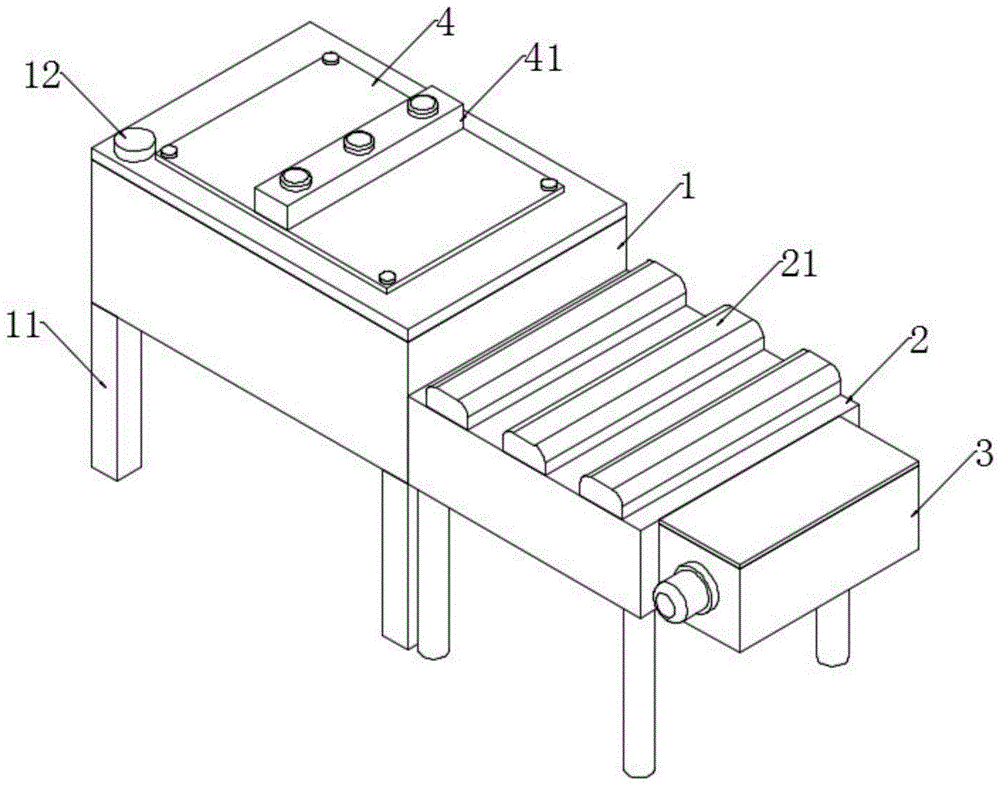 The implementation scenario is specifically as follows: the invention fixes the traction part at the front end of the white blank on the surface of a winding shaft 32, then starts a motor 31, drives the white blank to be conveyed through the winding shaft 32, guides the white blank into a transmitter 1 from an opening 13 at one side until the white blank reaches the lower part of a spray head 43 when dyeing is carried out, then starts an air pump in a frame 41, increases the air pressure in a storage box 44, sprays pigment from the spray head 43 to color the white blank, can adjust the output power of the air pump according to the thickness of the white blank to ensure the coloring effect of the white blank, guides the white blank into a color fixing machine 2 after the color is finished, then starts a fan 41 at the top end, switches on a power supply of an electric heating tube 23, starts heating by a resistance wire in the electric heating tube 23, converts wind power generated by the fan 21 into hot wind through the electric heating tube 23 to carry out color fixing treatment on the pigment on the white blank, and collects a finished product after the color fixing in a collection box 3, whole process does not have waste water, with even being used in on the cloth cover of pigment, the stable form surpasss traditional dyeing, really accomplish energy saving and emission reduction, and color, fixation and collection integral type shaping, work efficiency is greatly improved, the white base is in transportation process, can pass from first deflector roll 14 and second deflector roll 15 earlier, flatten the white base, avoid the fold phenomenon to influence the effect of coloring, and can be according to the thickness of white base, adjust the distance between first deflector roll 14 and the second deflector roll 15, when adjusting, rotate the carousel 12 on transmitter 1 top, drive the screw rod 16 rotation of bottom through carousel 12, screw rod 16 and slider 17 threaded connection, drive second deflector roll 15 through slider 17 and slide from top to bottom along transmitter 1 inner wall, thereby adjust the distance between first deflector roll 14 and the second deflector roll 15, the suitability of device has been increased.