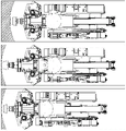 S200:截割作业时,保证机架4、伸缩型装载机构2、行走机构5等保持不动作,操作两根轨道伸缩油缸27动作,使得截割机构1相对机架4动作,实现掏槽及前进截割;同时,操作两根回转油缸18、两根升降油缸15动作,实现截割机构1上下、左右全断面截割。
