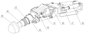 如图2、3所示,截割机构1由截割头10、悬臂段11、减速器12、连接筒13、截割电机14、升降油缸15、回转机构16、伸缩平台17、回转油缸18以及回转轴承19等组成。两根升降油缸15一端通过销轴与连接筒13铰接,另一端通过销轴与回转机构16铰接;截割电机14通过销轴与回转机构16铰接,通过两根升降油缸15的伸缩实现截割头10的上下摆动;回转轴承19上部与回转机构16连接,回转轴承19下部与伸缩平台17连接;两根回转油缸18一端通过销轴与回转机构16铰接;另一端通过销轴与伸缩平台17铰接;通过两根回转油缸18的伸缩实现回转机构16绕回转轴承19的轴线转动,进而实现截割头10的左右摆动。