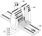 进一步地,请结合图1和图5所示,支撑架11包括基座113、立柱114、横梁115及两个滑动座116,基座113上设有增材区111和减材区112,横梁115设于基座113上,工作台12与基座113滑动连接,立柱114连接于横梁115及基座113之间,两个滑动座116分别滑动设于横梁115的两侧,其中一个滑动座116设于增材区111的上方,并与增材微锻装置2沿竖直方向滑动连接,另一个滑动座116设于减材区112的上方,并与减材装置3沿竖直方向滑动连接,驱动组件4还包括用于驱动滑动座116相对横梁115沿横向方向滑动的第四驱动机构44。为了使得支撑架11结构紧凑可靠,可将支撑架11设置为包括基座113、立柱114、横梁115及两个滑动座116的结构,其中,基座113沿纵向延伸设置,横梁115沿横向设置在基座113的上方,立柱114竖直连接于基座113及横梁115之间,为了使得支撑架11的刚度更佳,可将横梁115的两端下方均设置一个立柱114。增材区111和减材区112位于横梁115的两侧,且两个滑动座116分别与横梁115的两侧滑动连接,即其中一个滑动座116设于增材区111的上方,另一个滑动座116设于减材区112的上方,位于增材区111的滑动座116与增材微锻装置2滑动连接,位于减材区112的滑动座116与减材装置3滑动连接。其中,工作台12与基座113滑动连接、两个滑动座116分别与增材微锻装置2及减材装置3滑动连接,均可采用导轨方式连接,在此不再一一赘述。对于驱动组件4的驱动,第一驱动机构41驱动工作台12相对基座113沿纵向运动,第二驱动机构42驱动增材微锻装置2相对滑动座116沿竖直方向运动,第三驱动机构43驱动减材装置3相对滑动座116沿竖直方向运动,第四驱动机构44驱动滑动座116相对横梁115沿横向滑动,即,通过驱动组件4可分别实现增材微锻装置2及减材装置3的横向、纵向及竖直方向的三轴联动。Further, as shown in FIG. 1 and FIG. 5 , the