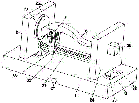 Referring to fig. 1, 2, 3 and 10, the fixing unit 2 includes a sliding slot 21, a scale 22, a displacement block 23, a linkage plate 24, a positioning turntable 25, an intermittent motor 26 and an adjusting assembly 27, wherein: the upper end of the workbench 1 is symmetrically provided with two sliding grooves 21 from left to right, scales 22 are symmetrically and uniformly arranged on the upper side of the sliding grooves 21 from front to back, displacement blocks 23 are arranged in the two sliding grooves 21 in a sliding manner, linkage plates 24 are arranged at the upper ends of the displacement blocks 23, positioning turntables 25 are arranged on the opposite sides of the two linkage plates 24 in a rotating manner, and circular rubber pads 251 are arranged on the opposite sides of the left positioning turntables 25 and the right positioning turntables in a detachable manner; the friction force between the snake-shaped table leg 6 can be increased through the round rubber pad 251, so that the stability of the snake-shaped table leg 6 during grinding is improved; an intermittent motor 26 is mounted on one side, far away from the middle part of the workbench 1, of the linkage plate 24 on the right side through a motor base, the output end of the intermittent motor 26 is connected with a positioning turntable 25 on the right side, and an adjusting assembly 27 is arranged in the workbench 1; in this embodiment, the rotation angle of the intermittent motor 26 is 90 ° each time; during specific work, firstly, the distance between the two linkage plates 24 is adjusted through the adjusting component 27 according to the length of the serpentine table leg 6, the accuracy of the linkage plates 24 during adjustment can be ensured through the scales 22, after the adjustment is completed, the serpentine table leg 6 is prevented from being placed between the two positioning turntables 25 by workers, and the serpentine table leg 6 is positioned at the axis of the positioning turntables 25 in the period, so that the serpentine table leg 6 can rotate along with the positioning turntables 25, meanwhile, the tangent line of the serpentine table leg 6 is kept parallel to the workbench 1, then the two linkage plates 24 are continuously adjusted towards the middle part of the workbench 1, the two positioning turntables 25 clamp and fix the serpentine table leg 6, and then, the grinding unit 3 is used for grinding the lower end face of the serpentine table leg 6; after the lower terminal surface processing of serpentine table leg 6 was accomplished, open intermittent type motor 26, intermittent type motor 26 drives serpentine table leg 6 through positioning turntable 25 and rotates 90, carries out to cooperate intermittent type motor 26 to carry out abrasive machining in proper order to the outer wall of serpentine table leg 6 through grinding unit 3.