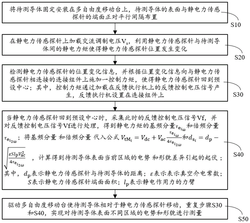 Fig. 1 is a flowchart of a method for simultaneously measuring a surface potential and a surface topography of a conductor according to an embodiment of the present invention, as shown in fig. 1, the measuring method includes steps S10-S50, which are detailed as follows: