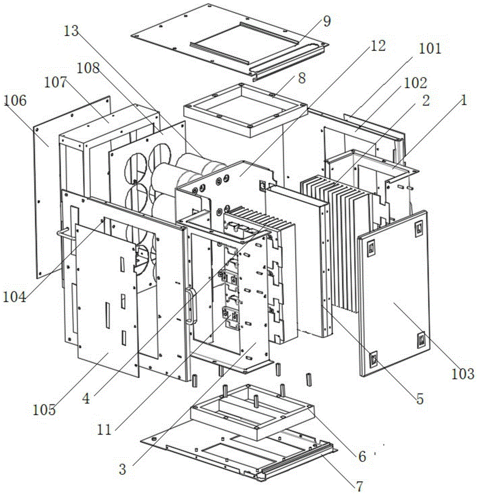 如附图1所示,一种功率模块的绝缘安装以及风道散热的装置,其特征在于:包括散热风道右1及散热器右2、散热风道左3及散热器左4、风道挡板5;其中散热器右与散热器左并列安装并且两者中间设置风道挡板隔档;其中散热风道右与散热风道左均套接在其对应的散热器外端形成竖直方向的贯通的风道;每个散热器的外侧位置位于风道的空腔中均固定一个第一功率模块;两个散热器、风道挡板位于后侧壁形成的后侧面固定安装第二功率模块;所述散热风道右与散热风道左的底部设置模块底部绝缘板6与模块底板7;模块底部绝缘板6与模块底板7均设置与风道对应的通孔实现风道的贯通;所述散热风道右与散热风道左的顶部设置模块顶部绝缘板8及模块顶板9;其中功率模块的外表面均设置对应的绝缘板;所述散热风道左、散热风道右、功率模块及其绝缘板形成方形的结构;方形的结构的外侧均设置金属面板。附图中101为模块右侧绝缘板、102为模块右侧板、103为模块前面板、104模块左侧板、105模块左侧绝缘板、106电容后绝缘板、107电容隔板、108电容前绝缘板8。As shown in FIG. 1 , a device for insulating installation of a power module and an air duct heat dissipation device is characterized in that: it includes a heat dissipation