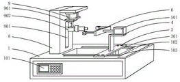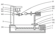 It should be noted that the top side of the workbench 1 is fixedly connected with the fixing box 8, the fixing box 8 is provided with a guide groove 801 towards one side of the groove 102, the top of the fixing box 8 is fixedly connected with the top plate 802, and the bottom of the top plate 802 is fixedly connected with the cylinder 9.