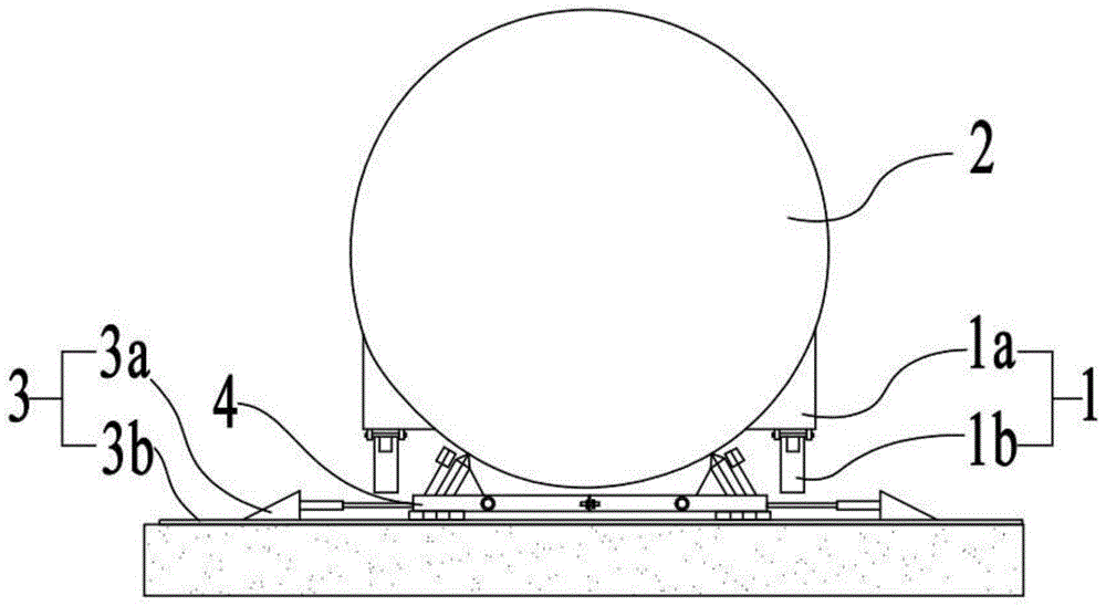 1-垂直顶升机构,1a-支座,1b-升降装置,2-盾构机,3-支撑台,3a-反力支座,3b-预埋板,4-移动调节装置,4a-托架平台,4b-滚轮装置,4b1-架体,4b2-滚轮,4b3-拉杆,4c-旋转装置,4d-移位装置。1-vertical jacking mechanism, 1a-support, 1b-lifting device, 2-shield machine, 3-support table, 3a-reaction force support, 3b-embedded plate, 4-movement adjustment device, 4a-support Frame platform, 4b-roller device, 4b1-frame body, 4b2-roller, 4b3-draw rod, 4c-rotation device, 4d-shift device.