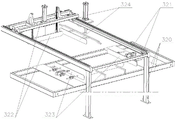 1、横向输送装置 11、横移升降装置 111、脚轮Ⅰ 12、横向输送机构121、挂钩 13、纵向移载装置 2、柔性输送辊道 21、支撑架Ⅰ 210、脚轮Ⅱ22、支撑架Ⅱ 23、伸缩机构 3、码垛装置Ⅰ 31、纵向输送装置 310、输送架3100、低架 3101、高架 31010、高支腿 31011、过渡板 31012、换向安装板3102、倾斜架 311、低架输送装置 312、倾斜输送装置 313、高架输送装置314、换向装置 32、横向移载装置 320、横移架 3200、横移纵梁3201、横移横梁 3202、横移框 3203、横向挡板 3204、横移导轨3205、压紧安装板 3206、换位安装架 321、横移机构 3210、横移驱动装置3211、横移轴 3212、横移轮 3213、横移带 322、拨动装置 3220、拨动架32200、横移滑块 32201、横移块 32202、拨动滑块 3221、拨动组件32210、伸缩导轨32211、拨板 323、压紧装置 3230、压板 324、换位装置3240、换位驱动装置 3241、换位挡板33、落料装置 330、落料带 331、托料板332、落料块 34、码垛升降装置 340、升降框 35、换盘装置 350、换盘架351、链输送装置 352、托盘供给站 353、托盘 4、码垛装置Ⅱ 41、加长输送装置410、加长架 4100、加长纵梁 4101、加长托板 411、加长输送机构4110、带驱动装置 4111、主动辊 4112、从动辊 4113、加长输送带5、码垛装置Ⅲ 51、终端输送装置 510、终端架 5100、纵向挡板52、终端横移装置 520、终移架。