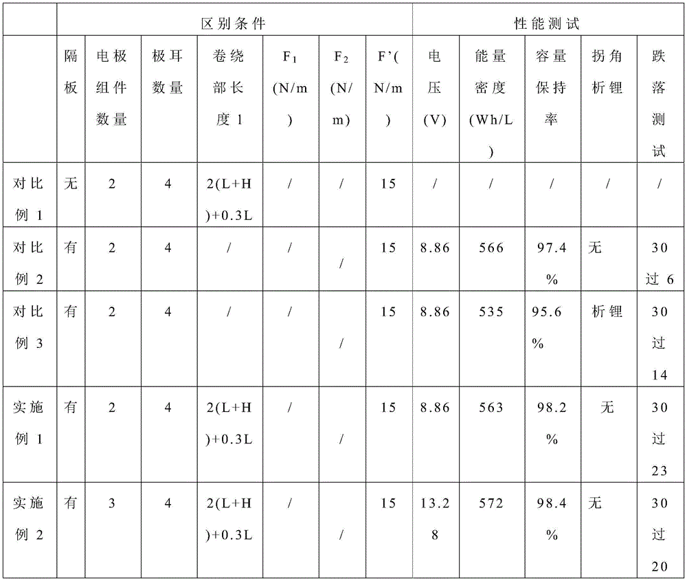 此外,实施例2通过增加电极组件20的数量、有效提高了电压和能量密度,同时,容量保持率和跌落性能测试基本不受影响。说明提高电极组件与外部器件的粘结性在多电极组件系统里同样适用,可以有效提高锂离子电池的安全性能。实施例3通过减少极耳数量,有效提高能量密度,同时,保持了优异的容量保持率和跌落性能。实施例4-6调控Z型隔膜卷绕部长度,起到稳定电极组件整体的作用,在能量密度损失有限的前提下,用于提高跌落测试性能。同时,保持了锂离子电池的输出电压和容量保持率。在实施例7-16中,增加电极组件和包装袋和(或)隔板之间增加粘结材料(如热熔胶),可以有效构建电化学装置100的整体性,能够避免电极组件20在包装壳10中晃动造成对极耳12的拉扯、损坏,从而减少电化学装置100在跌落等机械滥用过程中失效的安全问题。In addition, by increasing the number of