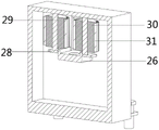 Referring to fig. 1 to 6, in the embodiment of the present invention, a quenching and oiling machine for producing strip steel includes an oiling machine body 1 and an oil storage tank 3, the oil storage tank 3 is fixedly connected to the left side of the upper end surface of the oiling machine body 1, an oil storage chamber 22 is formed in the oil storage tank 3, first side open slots 7 are formed in both sides of the oiling machine body 1, an oiling chamber 2 is formed in the oiling machine body 1, an inner connecting plate 24 is fixedly connected to the left side of the upper end surface of the inner side of the oiling chamber 2, a plurality of oil flow pipes 25 are fixedly connected to the lower end surface of the inner connecting plate 24, an inner fixing plate 26 is arranged in the oiling chamber 2, a through hole 27 is formed in the upper end surface of the inner fixing plate 26, a second side connecting plate 28 is fixedly connected to the right side of the front and rear end surfaces of the inner fixing plate 26, a connecting shaft 29 is rotatably connected between the second side connecting plate 28 and the oiling chamber 2, and a rotating roller 30 is fixedly connected to the outer circumferential surface of the connecting shaft 29, the outer circumference of the rotating roller 30 is fixedly connected with a fixed brush 31, the invention can insert one end of the strip steel from the left first side open slot 7 by arranging the oiling machine body 1, the oil storage tank 3, the oil storage cavity 22, the first side open slot 7, the oiling cavity 2, the inner connecting plate 24, the oil flow pipe 25, the inner fixing plate 26, the through hole 27, the second side connecting plate 28, the connecting shaft 29, the rotating roller 30 and the fixed brush 31, the strip steel moves to the right on the inner fixing plate 26, at the same time, the lubricating oil in the oil storage chamber 22 flows from the oil flow pipe 25 to both side surfaces of the strip steel, the strip steel moves right, when the strip steel moves to contact with the fixed hairbrush 31, the fixed hairbrush 31 uniformly coats the lubricating oil on the outer surface of the strip steel, so that the lubricating oil can be uniformly coated on the outer surface of the strip steel, and the effect of stable operation of the oil trowelling machine body 1 in the using process is achieved.