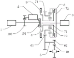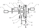 1、发动机;2、第一电机;3、第二电机;4、第一轴;5、第二轴;6、第一齿轮组件;61、第一齿轮;62、第二齿轮;7、行星齿轮机构;71、太阳轮;72、行星轮;73、齿圈;74、行星架;8、第一离合器;9、制动器;10、差速齿轮;101、第二离合器;102、第二齿轮组件;103、第三齿轮组件。