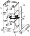步骤一:轿厢框2放置底座1上表面,垂平滑轨12沿水平滑轨11水平滑动,然后滑座32带动电缸31沿垂平滑轨12上下移动,电缸31活塞杆使两个拉杆34带动弧形导板41和弧形齿板42转动,使两个弧形导板41组成环形状,并套设内立柱21外,使导架8通过U形杆83和滚轴84沿环形的凸环形槽43进行圆周滑动;