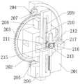 在旋转内齿轮203的端面通过螺栓固定装有旋转卡座202,旋转卡座202中设置大的方形通孔,其余的四个面上都有小通孔上下两个通孔中都插接有纵向夹块208,纵向夹块208在旋转卡座202内的一端挖成圆弧形,更适应金属管的固定,旋转卡座202侧面的两个通孔内都滑动插接有横向夹块218,横向夹块218在旋转卡座202内的一端也挖成圆弧形,两个纵向夹块208的另一端都焊接有纵向夹块连接板209,两个纵向夹块连接板209上通过螺栓固定有纵向夹块齿条210,上下两个纵向夹块齿条210错位安装并且有齿的部分是相对的,两个纵向夹块齿条210之间啮合有纵向夹紧齿轮211,纵向夹紧齿轮211上装有动力装置,纵向夹紧齿轮211转动可以带动两个纵向夹块齿条210同时向上下两侧分别运动或者向中间同时运动,继而带动两个纵向夹块208夹紧或者松开旋转卡座202中的金属管。