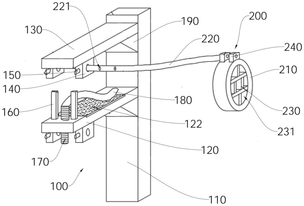 Further, the supporting assembly 100 further includes a second horizontal plate 130, the second horizontal plate 130 is disposed on the mounting post 110, the second horizontal plate 130 is disposed above the first horizontal plate 120, and the second horizontal plate 130 is connected to the connecting rope 220. Providing a connection point for the connecting cord 220 via the second cross plate 130 can provide a tension point for installation of the fall arrest assembly 200.
