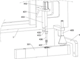 3. The photovoltaic frame machining-based integrated stamping die is characterized in that the deburring unit comprises a mounting frame (401), a second motor (402), an expansion rod (403), a first electric actuator (404), a second fixing plate (405), a guide pipe (409), an air nozzle (410), a housing (411), a rotating ring (412) and a second scraper (413); a mounting rack (401) is fixedly connected to the right part of the rack (1); a second motor (402) is arranged on the mounting frame (401); an output shaft of the second motor (402) is fixedly connected with a telescopic rod (403); a first electric actuator (404) is fixedly connected to the mounting frame (401); a second fixing plate (405) is fixedly connected with the telescopic part of the first electric actuator (404); the second fixing plate (405) is rotatably connected with the telescopic part of the telescopic rod (403); the telescopic part of the telescopic rod (403) is fixedly connected with the ejector rod (406); a guide pipe (409) is arranged at the right part of the rack (1) and positioned on the right side of the mounting rack (401); the lower end of the conduit (409) is communicated with an air nozzle (410); a cover shell (411) is fixedly connected to the outer annular surface of the lower part of the guide pipe (409); an annular groove is formed in the lower portion of the housing (411), and a rotating ring (412) is connected in the annular groove in a sliding mode in the circumferential direction; the inner side wall of the rotating ring (412) is fixedly connected with a second scraper (413).