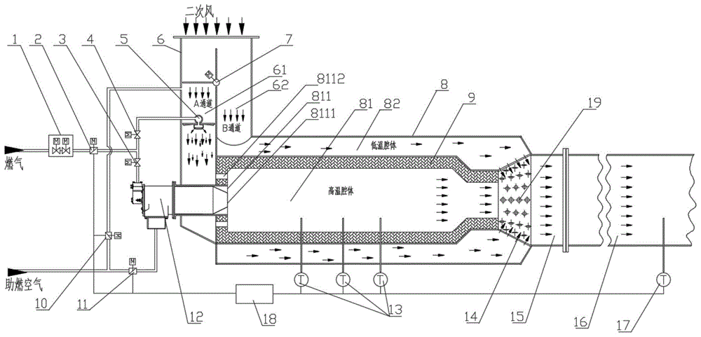 在一种具体的实施例中,一种超低氮热风炉系统,包括热风炉本体8,热风炉本体8包括高温腔体81、低温腔体82,低温腔体82套设在高温腔体81外,高温腔体81内设有第一热电偶13,第一热电偶13共设有3个,分别是第一热电偶A、第一热电偶B、第一热电偶C,高温腔体81与低温腔体82相邻的部位设置有高温腔体81的内保温层9,热风炉本体8一端设有二次风入口风道6,二次风入口风道6包括A通道61、B通道62,其中B通道62与低温腔体82连通,A通道61与高温腔体81之间设有高温腔体端板,在高温腔体端板上设有进气口8112,A通道61与高温腔体81通过进气口8112连通。A通道61与B通道62之间设有二次风分配阀7,A通道61中部位置设有燃气喷射器5,燃气喷射器5与第二燃气切断阀4连接,第二助燃风流量调节阀10与位于燃气喷射器5上方的A通道61连接;高温腔体81靠近A通道61一侧与烧嘴12连通,烧嘴12连接有第一燃气切断阀3、第一助燃风流量调节阀11;燃气流量调节阀2一端连接有第一燃气切断阀3、第二燃气切断阀4均与连接,另一端则连接有燃气安全切断阀组1;In a specific embodiment, an ultra-low nitrogen hot blast stove system includes a hot blast stove body 8 , and the hot blast stove body 8 includes a