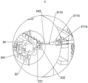 如图11和图14所示,加工组件5包括支架二51、电机二511、电机三54、转动轴四52和转动轴六53,电机二511对称固定设置在支架二51的上表面,电机三54固定设置在靠近支架二51侧边的上表面中部,电机二511和电机三54用来作为加工组件5的驱动源,电机二511的输出轴表面固定设置有转轮一512,转轮一512的表面滑动设置有传动带一513,转动轴四52下端与支架二51转动配合,转动轴四52靠近上端表面固定设置有转轮三525,转轮一512和转轮三525通过传动带一513连接,转动轴四52靠近转轮三525的表面固定设置有转轮二524,,转动轴六53下端与支架二51转动配合,转动轴六53的上部表面固定设置有转轮四531,转轮四531的表面滑动设置有传动带二532,转轮二524和转轮四531通过传动带二532连接,转动轴四52下方靠近转轮二524的表面固定设置有齿轮一521,齿轮一521的两侧对称转动设置有齿轮二523,齿轮一521和齿轮二523相啮合,齿轮二523的下端面固定设置有转动轴五522,转动轴五522贯穿支架二51的表面,并作转动配合,转动轴六53下方靠近转轮四531的表面固定设置有齿轮四535,齿轮四535的两侧对称转动设置有齿轮三533,齿轮三533和齿轮四535相啮合,齿轮三533的下端面固定设置有转动轴七534,转动轴七534贯穿支架二51的表面,并作转动配合,电机三54的输出轴的表面固定设置有齿轮五541,齿轮五541的两侧对称设置有齿轮六5511,齿轮五541和齿轮六5511相啮合,齿轮六5511的下端面固定设置有转动轴八55,转动轴八55下端贯穿支架二51的表面,并作转动配合,转动轴四52用来驱动攻螺纹件5221来对铝制软管进行管头的螺纹制作,转动轴六53用来驱动切削件5341对铝制软管的管肩部位进行倒角和打磨,转动轴八用来驱动切除块556对铝制软管不规则的管尾进行切除,转动轴八55的下端固定设置有连接座551,连接座551的侧面固定设置有驱动轴552,驱动轴552的表面转动设置有齿轮七553,支架二51的下表面对称固定设置有两组呈圆形排列的若干连接柱555,连接柱555的下端面固定设置有内啮合齿轮八554,齿轮七553与内啮合齿轮八554相啮合,驱动轴552的下端面固定设置有切除块556,转动轴五522的下端面固定设置有攻螺纹件5221,转动轴七534的下端面固定设置有切削件5341。
