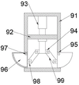 如图4和图5所示,所述取样组件9包括取样筒91、第二伸缩杆93和取样盒96,所述取样筒91安装在安装板85的底部,第一固定块94内固定安装有隔板92,取样筒91内顶部安装有第二伸缩杆93,第二伸缩杆93的自由端与隔板92滑动配合,第二伸缩杆93的底部周向安装有若干组第一固定块94,第二伸缩杆93与隔板92滑动配合可保证第一固定块94在取样筒91内垂直升降,所述取样筒91底部侧面周向甚至有若干组开口槽95,所述取样盒96上固定安装有转动销97,转动销97转动安装在开口槽95内顶部,所述取样盒96位于取样筒91内的一侧安装有第二固定块98,所述第一固定块94与第二固定块98之间通过第二连接杆99转动连接,在第二伸缩杆93的伸缩作用配合第二连接杆99的转动连接,可使得取样盒96在开口槽95内实现转动,即实现将取样盒96伸出取样筒91外侧以及将取样盒96收回取样筒91内,在取样盒96伸出取样筒91外侧时配合钻杆55的转动,可将目标深度的土样收集至取样盒96内并收回取样筒91内,即可完成土样的采集。As shown in FIGS. 4 and 5 , the