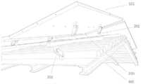 多块光伏板101及多块光伏板102设置在屋顶400上。其中,多块光伏板101及多块光伏板102均可通过多个调节机构201、多个调节机构202单独控制,光伏板可能存在由于与阳光的角度变化存在的互相之间的遮挡问题。所述光伏板倾角通过调节机构202调节,所述光伏板方位角通过调节机构201调节,所述调节机构201与调节机构202连接至同一支架,所述调节机构202位于所述支架下部,所述调节机构201位于所述支架上部。如图4所示为未调整状态结构图,调节机构201、调节机构202均处于压紧状态。如图5所示为调整倾角状态结构图,靠外侧的调节机构202根据计算调节光伏板倾角向上进行调整,若计算调节光伏板倾角超过调节机构202所能调节的边界光伏板倾角,则实际倾角的调整角度为调节机构202所能的调整的边界光伏板倾角。如图6为调整倾角及方位角状态结构图。除靠靠外侧的调节机构2012根据计算调节光伏板倾角向上进行调整,靠右侧的调节机构201也进行抬起。调节机构201的抬起角度通过计算光伏板方位角确定。若计算调节光伏板方位角超过调节机构201所能调节的边界光伏板方位角,则实际倾角的调整角度为调节机构201所能的调整的边界光伏板方位角。