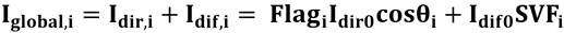 其中,Iglobal,i为光伏板微元i的全辐照度值,Idir,i为光伏板微元i的直射辐照度值,Idif,i为光伏板微元i的散射辐照度值,Flagi为光伏板微元i的遮挡判断值,Idir0为此刻时间太阳直射辐照强度, 为光伏板微元i的太阳入射角,Idif0为此刻时间水平面散射辐照强度,SVFi为光伏板微元i的天空角系数。
