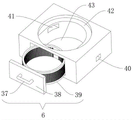 10.根据权利要求9所述的一种药物研磨器,其特征在于:所述底座(1)的中心设有蒸发室(43),所述蒸发室的顶端呈开口设置,所述蒸发室(43)顶端环绕设有支撑沉台(42),所述底座(1)侧壁上部设有蒸发孔(41),所述底座(1)平行于蒸发孔(41)的侧壁底部设有进气孔(40),所述进气孔(40)的高度低于蒸发孔(41)的高度;所述回收组件(6)包括把手(37)、封板(38)和纱网盒(39),所述纱网盒(39)贯穿底座(1)侧壁滑动设于蒸发室(43)内,所述封板(38)设于纱网盒(39)侧壁,所述把手(37)设于封板(38)侧壁。