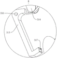 如图 6和图9所示,具体的,左转轴37与右转轴38内部均贯穿开设有活动槽312,两个活动柱313均滑动安装在活动槽312内部,两个活动柱313相近一端为插接配合,用于两个活动柱313的位移联动,凹形杆315内部贯穿转动安装有固定柱316,固定柱316的两端固定安装在左转轴37或右转轴38内部,凹形杆315一侧固定安装有若干钉齿317,用于钩挂布带4。As shown in Figure 6 and Figure 9, specifically, the inside of the