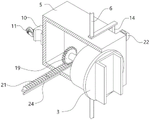 推移翻转组件包括设置在靠近推板7侧并固定设置在夹固转块3内侧部的从动齿轮19,对应滑盒5内侧前后壁上均设有开口20,开口20上滑动贯穿有和从动齿轮19啮合连接的齿条板21,且齿条板21后端设置有和推板7外表面相接触的顶块22,顶块22为半球体结构,推板7能够推动顶块22进行前后移动;The push and flip assembly includes a driven