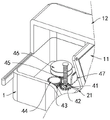 心电图治疗仪11背侧且位于主防护盒体1的底部设置有辅助收线机构4,辅助收线机构4包括:随动套环条41、棘轮轴42、配合棘轮43、齿轮一44、齿轮二45、收线轮46,托板21的背侧面固定连接有随动套环条41,且随动套环条41的背端设置有棘轮轴42,棘轮轴42下端背侧且位于主防护盒体1的底面转动连接有配合棘轮43,且配合棘轮43的上端面固定连接有齿轮一44,且随动套环条41的背端内部为滚珠螺母结构,该棘轮轴42由转动连接于主防护盒体1底部的棘轮和棘轮上方固定连接的滚珠螺纹杆构成,棘轮轴42下端背侧且位于主防护盒体1的底面转动连接有齿轮一44,该齿轮一44与棘轮轴42下端的棘轮互相啮合,齿轮一44的右侧方啮合有齿轮二45,且齿轮二45的底部转动连接于主防护盒体1的底面,齿轮二45的上端固定连接有收线轮46,收线轮46前侧方且位于主防护盒体1的底面固定连接有线头卡板47,且线头卡板47的上端面均匀开设有圆弧豁口,其用于卡托住心电图治疗仪11使用后的连接线的连接端。The electrocardiogram
