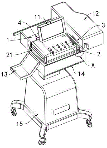 工作原理:在使用时,当医护人员需要使用本装置时,可以通过手扶主防护盒体1的外壁并通过主防护盒体1底部安装的移动底座15推动着本装置进行便携的移动,随后待本装置移动至患者的床边后,此时医护人员通过对向打开位于主防护盒体1上端面滑动连接的上滑盖12,而当上滑盖12对向发生滑动位移后,则会顺势带动位于其前侧内壁固定连接的拉绳25牵引着绑柱22均沿着斜槽部23的轨迹逐渐向上发生滑动位移,绑柱22同时带动托板21内部放置的心电图治疗仪11沿着斜槽部23的轨迹逐渐上升,由于托板21滑动连接于主防护盒体1的内壁且加之托板21是通过其前侧的绑柱22与拉绳25和上滑盖12的内壁固定连接,故在上滑盖12对向滑动位移时,则会在拉绳25的牵引下带动托板21及心电图治疗仪11同步向上发生垂直位移,当绑柱22运动至直槽部24的内部,直槽部24为水平设置,加之结合上滑盖12与主防护盒体1之间的滑动摩擦阻力,故托板21在不受外力的作用下,则会使得托板21与心电图治疗仪11始终处在主防护盒体1内部的最高点,即如图1至图2所示的状态,此时的心电图治疗仪11即可供医护人员对患者进行心脏疾病的内科疾病检查,通过医护人员手动打开推动上滑盖12对向位移后,便会自动带动位于主防护盒体1内部的心电图治疗仪11同步上升以供医护人员直接使用,从而大大提升了医护人员使用心电图治疗仪11时的便捷度,进而也提高医护人员使用心电图治疗仪11检查患者的效率。Working principle: When in use, when the medical personnel need to use the device, they can push the device to carry out portable movement by holding the outer wall of the main