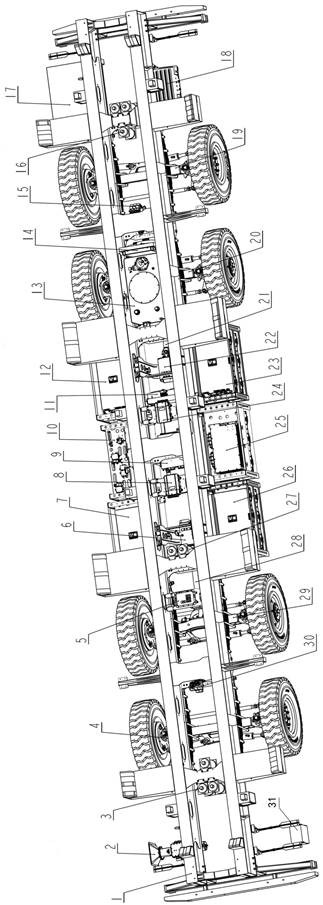 本发明的车架1为矩形结构框架,车辆底盘使用四根车桥,采用8×4中置分布式驱动的整车布置形式,车辆采用九块高压电池。四合一控制器9进行整流后,将一部分能量传递给电机控制器一8,电机控制器一8控制电机一6运转,电机一6通过传动轴一28驱动转向驱动桥一29运转。四合一控制器9将另一部分能量传递给电机控制器二24,电机控制器二24控制电机二22运转,电机二22通过传动轴二21驱动转向驱动桥二20运转。从而驱动车辆行驶。The vehicle frame 1 of the present invention is a rectangular structural frame, the vehicle chassis uses four axles, adopts an 8×4 center-mounted distributed drive vehicle layout, and the vehicle uses nine high-voltage batteries. After the four-in-one controller 9 rectifies, a part of energy is delivered to the motor controller one 8, and the motor controller one 8 controls the operation of the motor one 6, and the motor one 6 drives the steering drive axle one 29 through the drive shaft one 28 to run. The four-in-one controller 9 transmits another part of energy to the