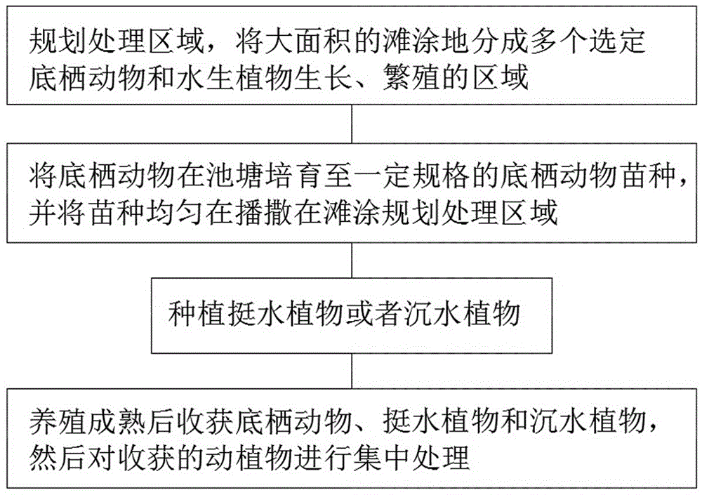 本发明涉及滩涂地修复改造的技术领域,尤其是涉及一种基于动植物的滩涂地重金属修复方法。The invention relates to the technical field of tidal flat restoration and reconstruction, in particular to a method for restoration of heavy metals in tidal flats based on animals and plants.