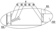 As shown in fig. 3, as a preferred embodiment of the present invention, the one-way guiding portion 6 includes a first baffle 61 rotatably mounted on an inner wall of the fixed cylinder 511 and attached to the water inlet 514, a fixed plate 62 is fixedly mounted between inner walls of the fixed cylinder 511, a pressing spring 63 connected to the first baffle 61 is fixedly mounted on a side wall of the fixed plate 62, a second baffle 64 attached to an inner wall of the conduit 513 is rotatably mounted on an inner wall of the conduit 513, and a limiting block 65 mutually matched with the second baffle 64 is fixedly mounted on an inner wall of the conduit 513.