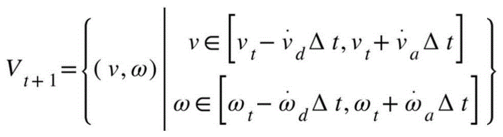 wherein v is t+1 Is the linear velocity, v, of the robot at time t +1 t Is the linear velocity, omega, of the robot at time t t The angular velocity of the robot at the time t is shown, and delta t is the time difference from the time t to the time t + 1;and &>Is the maximum linear acceleration and the maximum linear deceleration of the robot;And &>Is the maximum angular acceleration and the maximum angular deceleration of the robot;