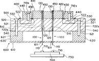 容置件870包括两个设有通孔871A、872A的导板871、872,以及一对用来通过板860对两个导板871、872进行紧固的壁823。两个导板871、872中的通孔871A、872A用来插入探针850的接触部851,并使它与半导体集成电路700的电极710的位置对准以供测量。