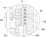 As shown in fig. 2 and 3, the positioning member 5 includes a sliding block 51, a positioning block 52, positioning inserting rods 53 and locking bolts 54, the sliding block 51 is fixedly installed on the left and right side baffles 31 of the construction hanging basket 3, a sliding groove 101 is formed in the side wall of the vertical rod 10 attached to the construction hanging basket 3, the sliding block 51 slides up and down in the sliding groove 101, a positioning groove 511 is formed in the outer surface of the sliding block 51, a positioning block 52 is slidably arranged in the positioning groove 511, a plurality of positioning inserting rods 53 are fixedly arranged on the outer surface of the positioning block 52, a plurality of positioning inserting holes 102 are formed in the side wall surface of the sliding groove 101 in the vertical direction, a plurality of positioning inserting rods 53 are in sliding insertion alignment with the positioning inserting holes 102, locking bolts 54 are connected to the left and right side baffles 31 of the construction hanging basket 3 in a threaded manner, and the end surfaces of the locking bolts 54 penetrate through the sliding block 51 and are rotationally connected to the surface of the positioning block 52; when the construction hanging basket 3 is required to be fixed in operation, a constructor can manually rotate the locking bolt 54 on the baffle 31 on the left side at the moment, the end part of the locking bolt 54 moves towards the positioning groove 511 so as to push the positioning block 52 to slide towards the side surface of the sliding groove 101, so that the positioning inserting rods 53 are inserted into the corresponding positioning inserting holes 102, then the constructor inserts the positioning inserting rods 53 on the baffle 31 on the right side into the positioning inserting holes 102 in the same manner, so that the construction hanging basket 3 in an unfolded or non-unfolded state is conveniently fixed, the constructor can conveniently perform safe and stable construction operation on the inner wall of the long and narrow deep foundation pit in the construction hanging basket 3, and meanwhile, when the baffle 31 on the front side and the rear side of the construction hanging basket 3 is required to be horizontally unfolded, the constructor also needs to perform positioning and fixing on the construction hanging basket 3 through the positioning member 5, and then the baffle 31 on the front side and the rear side surfaces can be unfolded; when the construction basket 3 is required to move up and down, a constructor in the construction basket 3 can manually reversely rotate the locking bolt 54 at this time, so that the plurality of positioning inserting rods 53 on the positioning blocks 52 are separated from the plurality of positioning inserting holes 102, the construction basket 3 can move up and down conveniently, the sliding blocks 51 arranged on the baffle plates 31 on the left side and the right side of the construction basket 3 slide up and down in the sliding grooves 101, the construction basket 3 can be guided up and down, the phenomenon of swinging or shaking is prevented when the construction basket 3 moves up and down, the potential safety hazard is further influenced when the constructor or the construction equipment takes the basket, and when the construction basket 3 is separated from the vertical rods 10, the lifting mechanism 2 is required to be controlled carefully at this time, so that the steel wire rope 4 is in a tight state, and when the steel wire rope 4 is prevented from being in a loose state, the positioning inserting rods 53 are separated from the positioning inserting holes 102, the phenomenon of shaking the construction basket 3 is caused, and the safe use of the construction basket 3 is further influenced.