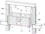 As shown in fig. 2, the construction basket 3 can be fixed on the vertical rod 10 by arranging positioning members 5 on the baffle plates 31 on the left side and the right side, the end part of the steel wire rope 4 is detachably connected with the construction basket 3 by a connecting member 6, the baffle plates 31 on the front side and the rear side of the construction basket 3 are rotatably arranged on the bottom plate 32 of the construction basket 3 by a rotating shaft 33, torsion springs are sleeved on the rotating shaft 33, the upper ends of the outer surfaces of the baffle plates 31 on the front side and the rear side are connected with one end of a tensioning rope 7, and the other end of the tensioning rope 7 penetrates through a pulley assembly 8 arranged at the lower part of the bottom plate 32 to be connected with the connecting member 6; when the door-shaped bracket 1 is fixed to the side wall of a long and narrow deep foundation pit and when the front and rear side baffles 31 of a hanging basket are required to be unfolded, taking the baffle 31 on the front side of the hanging basket as an example, a constructor can fix the construction hanging basket 3 on two side vertical rods 10 of the door-shaped bracket through positioning members 5 arranged on the baffles 31 on the left and right sides, then disconnect a connecting member 6 connected on a steel wire rope 4 from a threaded hole 321 on a bottom plate 32, then connect the steel wire rope 4 with a connecting member 6 on a tensioning rope 7 connected on the baffle 31 on the front side, then control a lifting mechanism 2 to wind the steel wire rope 4 by the constructor, at the moment, the wound steel wire rope 4 can be pulled upwards from an inserting hole 322 formed on the bottom plate 32 through the connecting member 6, and the other end of the tensioning rope 7 can drive the baffle 31 on the front side to be unfolded to be in a horizontal state and be flush with the bottom plate 32, if the baffle 31 on the rear side is required to be unfolded, and then the end of the tensioning rope 7 is required to be pulled by the constructor and connected with the steel wire rope 4 is dismounted from the threaded hole 321 on the bottom plate 32, and then the end of the tensioning rope 7 is required to be connected with the baffle 31 on the left and the right side of the baffle 3 by the connecting member 6; then, the baffle 31 on the rear side is also unfolded in the same manner as described above, if the construction hanging basket 3 to be unfolded is moved, as the baffles 31 on the front side and the rear side of the unfolding are fixed, then constructors can connect the steel wire rope 4 onto the bottom plate 32 through the connecting member 6 and then disengage the positioning member 5 from the vertical rod 10 for positioning, so that the construction hanging basket 3 to be unfolded can slide up and down between the vertical rods 10 on the two sides, and hoisting and transferring of large-size construction equipment are realized.