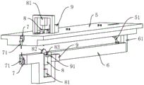 参照图3和图4,切槽轮82周面均匀密布成形有多个切齿821,切槽轮82内成形有抽尘腔822,切槽轮82周面对应相邻切齿821之间形成抽尘孔823,抽尘孔823与抽尘腔822连通,驱动轴83一端成形有与抽尘腔822连通的排尘孔831,承接架5和内支撑架6上还固定有抽尘部件9,抽尘部件9上连接有抽尘管91,抽尘管91与两切槽轮82的驱动轴83的排尘孔831连通。钢管输送过程中,抽尘部件9工作,切槽轮82同时转动,随钢管输送与切槽,切槽轮82产生的铁屑将被抽尘孔823抽送至抽尘腔822,然后废屑再通过排尘孔831送出,以便于后续焊接加工。