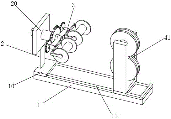 图中:1、底板;10、固定板;11、导向杆;12、挡位板;2、支撑板;20、安装板;21、伺服电机;22、转动杆;23、主传动齿轮;24、副传动齿轮;3、支撑管;30、支撑架;31、连接管;32、传动轴;33、连接架;34、组装盘;340、线束盘;4、组装架;40、转动轴;41、放线盘。Among the figure: 1, bottom plate; 10, fixed plate; 11, guide rod; 12, stop plate; 2, support plate; 20, installation plate; 21, servo motor; 22, rotating rod; 23, main transmission gear; 24 , secondary transmission gear; 3, support pipe; 30, support frame; 31, connecting pipe; 32, transmission shaft; 33, connecting frame; 34, assembly plate; 340, harness plate; 4, assembly frame; 40, rotating shaft; 41, pay-off reel.