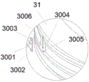 在优选的另一实施例中,如图2和图6所示,所述刮油装置包括开设在立式外环31外侧壁或立式内环32内侧壁的漏油腔3004,所述漏油腔3004内安装有第一刮板3001,所述漏油腔3004底侧开设有与立式罐体1的储油腔11相通的漏油孔3005;第一刮板3001与立式罐体1的内壁的螺纹间隙配合,第一刮板3001在随着活动密封盖3转动的过程中,刮动立式罐体1内壁上的芝麻香油聚集在第一刮板3001一侧,随着刮动芝麻香油的量增多而向下流,而第一刮板3001设置在漏油腔内,如此可将挂壁的芝麻香油刮到漏油腔3004内,通过漏油孔3005进入有效储油腔11(即活动密封盖3下方的储油腔11)内;所述进油孔道21包括多个贯通中心柱2底部侧面的支路孔道22,均匀分散为多个支路孔道22,有利于进油顺利,另一方面,也有利于缩小局部的开孔,有利于中心柱2和活动密封盖3在此处的稳定运行和同心配合;所述储油腔11为环形腔。In another preferred embodiment, as shown in Figure 2 and Figure 6, the oil scraping device includes an