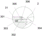 在优选的另一实施例中,如图2和图4所示,所述密封装置包括多组均匀分布并横向开设的第一导向孔301和纵向开设的第一限位孔305相通;所述第一导向孔301内配合设置第一复位弹簧303和第一导向杆302,所述第一导向杆302的外端固定有与中心柱2外侧壁或立式罐体1内侧壁配合的柔性密封环304,第一复位弹簧303的作用为使得柔性密封环304抵紧,提升密封性,所述柔性密封环304可为胶质密封圈,可根据实际情况进行选择,所述第一限位孔305内设置有固定在第一导向杆302上的第一限位柱306。In another preferred embodiment, as shown in Fig. 2 and Fig. 4, the sealing device includes a plurality of uniformly distributed