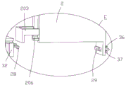 In this embodiment, a box sleeve 27 with an open end is fixedly installed on the island board 101, the inclined baffle 26 is slidably disposed in the box sleeve 27, one end of the inclined baffle 26 passes through the open end of the box sleeve 27 and then extends into the pushing slideway 102, a return spring 30 is disposed between the inner cavity of the box sleeve 27 and the inclined baffle 26, one end of the return spring 30 is fixedly connected with the end of the inclined baffle 26, the other end is fixedly connected with the inner wall of the box sleeve 27, and elastic sliding of the inclined baffle 26 is realized under the elastic action of the return spring 30. The minimum elastic force of the return spring 30 is greater than the maximum elastic force of the tension spring 34, so that when the push-pull plate 2 slides forwards, the inclined plane baffle 26 does not slide when the row teeth 3202 are abutted against the inclined plane of the inclined plane baffle 26, so that the toothed plate 32 and the lower hook plate 28 slide backwards, after the lower hook plate 28 is overlapped with the upper hook plate 29, the end face of the lower hook plate 28 is abutted against the push-pull plate 2, so that the toothed plate 32 and the lower hook plate 28 stop sliding backwards, and then the push-pull plate 2 continues to slide forwards, so that the row teeth 3202 push the inclined plane baffle 26 to slide towards the inside of the box sleeve 27, so that the row teeth 3202 are staggered with the inclined plane baffle 26, and then the inclined plane baffle 26 is pushed to return under the elastic force of the return spring 30, so that the next abutment is performed on the row teeth 3202.