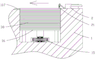 In this embodiment, the support table 1 is provided with the avoidance hole 108 corresponding to the gear 15, the avoidance hole 108 penetrates through the pin header accommodating groove 106 and then is communicated with the pull-back slide way 103, and the left side of the outer peripheral surface of the gear 15 extends to the outer right side through the avoidance hole 108 and extends into the pull-back slide way 103 through the avoidance hole 108. Specifically, the avoidance hole 108 is used for avoiding the gear 15, so that the left side of the gear 15 passes through the avoidance hole 108 and then extends to the outside, the screw 14 can be driven to rotate clockwise or anticlockwise by applying a rotating force to the gear 15 from the outside, so that the height of the support plate 16 can be finely adjusted, the height of the uppermost pin 38 can be adjusted to a specific height, and meanwhile, the height of the support plate 16 can be reduced, so that the depth of the pin accommodating groove 106 reaches the depth required by accommodating the pins 38; the right side of the gear 15 extends into the pullback slide 103 through the relief hole 108 so that the toothed plate 32 can engage with the gear 15 when positioned in the pullback slide 103.