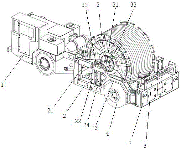 参照附图1所示,本实施例铰接式电缆卷放车,包括牵引车1和铰接在所述牵引车后部的后车架2。所述电缆卷放车的动力系统均由所述牵引车1上的防爆柴油机驱动变量液压泵提供,其行走机构由前轮驱动,后轮随动。所述电缆卷放车的动力系统、液压系统均为现有技术。Referring to the accompanying drawing 1, the present embodiment articulated cable winding vehicle includes a