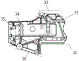 踏板支架连接部35位于前组合支架的左部,踏板支架连接部35上设有三个连接孔,踏板支架连接部35与踏板支架相连;The pedal
