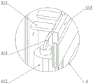 活动空心板409中部安装有第一电推杆412,第一电推杆412伸出端顶端连接柔性塑料板413,活动空心板409顶端一侧铰接有挡条414,挡条414顶面边缘通过弹簧铰链均匀连接有活动顶板415,柔性塑料板413顶端连接挡条414侧面中部;The middle part of the movable