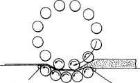 | NL7714214A (en) * | 1977-12-21 | 1979-06-25 | Rijkaart Machinefab | Continuous rolling of layered dough - with rotating rollers on common pitch circle between two flanges with longitudinal mixing forces on dough eliminated to give leaf finish |