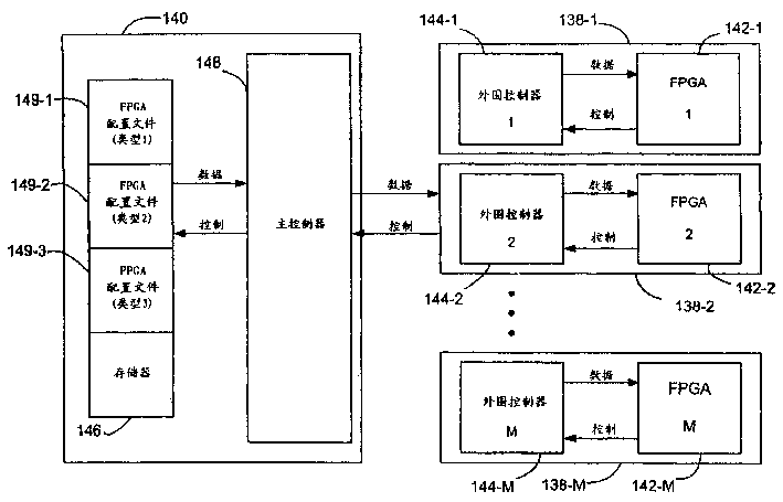 如现在所看到的,存在于输出卡138-1到138-M中的每一个上的是FPGA142-1到142-M以及与FPGA 142-1到142-M相耦合的外围控制器144-1到144-M。另一方面,存在于配置控制卡140上的是存储器146和耦合到存储器146的主控制器148,所述存储器146用作用于FPGA 142-1到142-M中的每一个的配置信息的共享储存库。最后,主控制器148耦合到外围控制器144-1到144-M中的每一个。如下面将要更加全面地描述的,前面提到的FPGA142-1到142-M、外围控制器144-1到144-M、主控制器148和存储器146之间的链接用于使得能够响应于从FPGA 142-1到142-M流动到存储器146的信号,而使控制信息从存储器146流动到FPGA 142-1到142-M。但是,应当注意,尽管图3示出了一系列分离的外围控制器144-1到144-M,每一个对应于FPGA 142-1到142-M中的一个,但是完全可以设想,存在于每个外围控制器中的功能可以替换为置于相应的FPGA中。当然,在这样的结构中,FPGA 142-1到142-M中的每一个将直接耦合到主控制器148。此外,FPGA142-1到142-M将执行在下面描述为由外围控制器144-1到144-M执行的那些功能。As now seen, present on each of the output cards 138-1 through 138-M is an FPGA 142-1 through 142-M and a peripheral controller 144-M coupled to the FPGA 142-1 through 142-