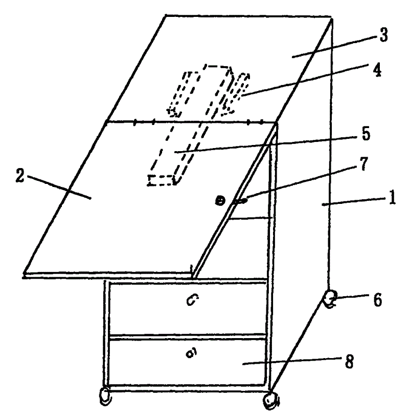 A kind of extra bed sick bed bedside cupboard, it is mainly by cabinet 1, cabinet door 2, guide way 4, sliding support 5, universal wheel 6, lockset 7, drawer 8 compositions such as grade, as shown in Figure 1, the top of cabinet door 2 is hinged by bearing pin and cabinet 1, installed inside at the top board 3 of cabinet 1 has flute profile guide way 4, can support cabinet door 2 when extraction is installed and make its sliding support that is in level 5 in this guide way 4, as shown in Figure 2, slippage guide way 4 when preventing that sliding support 5 from outwards pulling out, an anti-skidding block piece can be set on sliding support 5, this anti-skidding block piece can design as required voluntarily, adds block or backing pin as adopting an end; For the ease of moving and the location of cabinet, the universal wheel 6 that has self-locking device is installed in the bottom of cabinet 1.In addition, for easy to use and protection patients'benefit, also lockset 7 can be installed on cabinet door 2, in the bottom of cabinet door 2 one to two drawer 8 be installed, drawer 8 also can be designed to band pin drawer.
