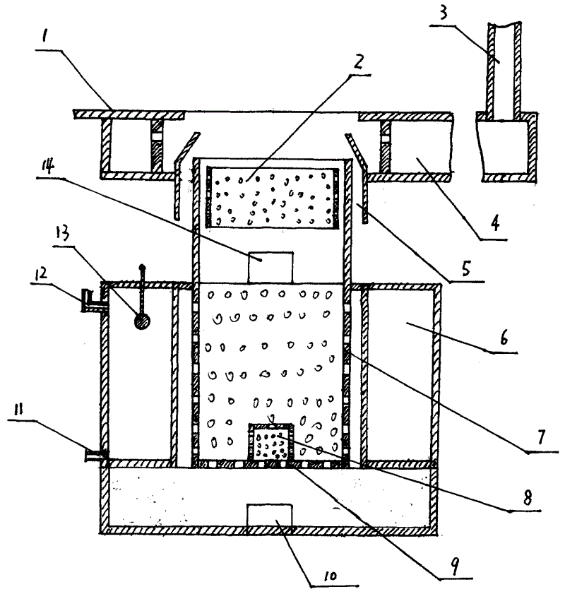 在炉面板1下设烟尘过滤水道4,烟尘过滤水道4内与炉膛连通,外与排烟管3相连;炉膛内设炉胆7,炉胆7底部置于炉桥9上,炉胆7下部外壁设通风孔,炉胆7上部外壁密封;炉胆7上部外侧适当位置设进风道5;炉胆7内部上设缓火圈2,中与加料口14连接,下设炉心进风管8;炉桥9下部设通风口和排灰口10;在炉胆7下部外侧设由出水管11,进水口12,浮标13组成的水箱6。Under the furnace panel 1, a smoke and dust filtering channel 4 is provided. The inside of the smoke and dust filtering channel 4 is connected to the furnace, and the outside is connected to the smoke exhaust pipe 3; Ventilation holes are arranged on the outer wall, and the outer wall of the upper part of the furnace 7 is sealed; an air inlet duct 5 is provided at an appropriate position on the outer side of the upper part of the furnace 7; The bottom of furnace bridge 9 is provided with air vent and ash outlet 10; the outer side of furnace 7 bottom is provided with outlet pipe 11, water inlet 12, and water tank 6 composed of buoy 13.